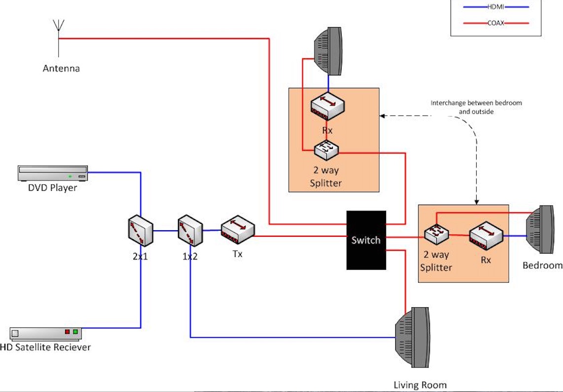 This is a post from a customer that integrated HDTV Supply's hdmi-to-coax-splitter http://www.hdtvsupply.com/hdmi-to-coax-splitter.html with a Magnadyne VCS-10